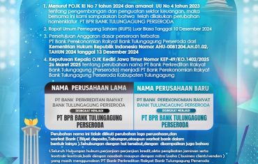 Pengumuman perubahan nama PT Bank Perkreditan Rakyat Bank Tulungagung (Perseroda) menjadi PT Bank Perekonomian Rakyat Bank Tulungagung Perseroda