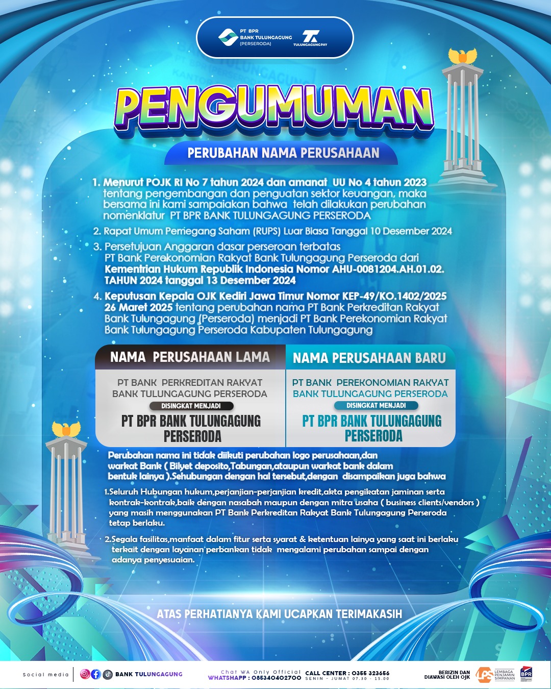 Pengumuman perubahan nama PT Bank Perkreditan Rakyat Bank Tulungagung (Perseroda) menjadi PT Ban...